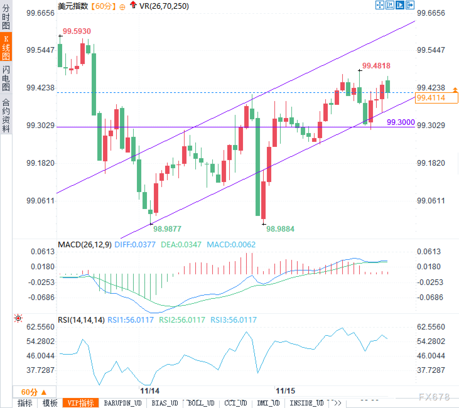 美元指数60分钟图维持沿上升通道运行,现报99.4114,处在通道中部与前期枢轴99.42附近。近两日低点抬高、高点小幅延伸,99.48与99.59形成压制带。MACD双线位于零轴上方但趋平,柱能量收敛,显示上行动能放缓而趋势仍偏多。RSI约56,处于中性偏强、未过热。