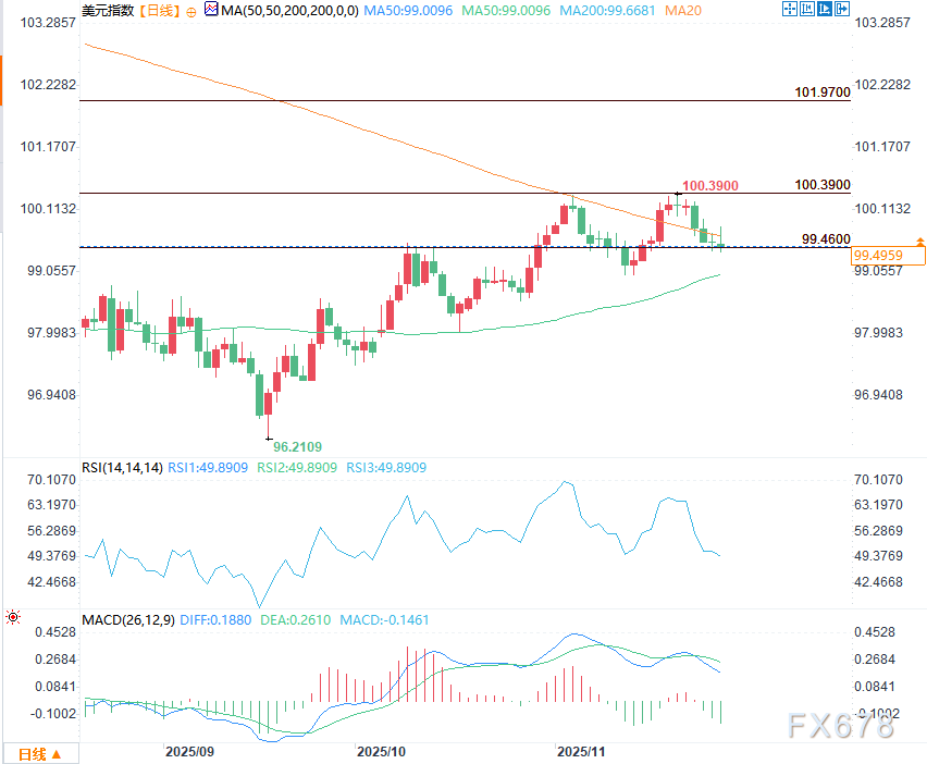 当前交易员需重点关注美元指数价格附近形成的多重阻力压制:短期枢轴位99.693与200日均线99.707恰好形成共振阻力带,这一关键区间有效抑制了美元指数的上行势头。从技术走势来看,若价格持续跌破这一阻力区间且无法快速收复,短期内可能进一步触发市场对50日均线及主要低点98.991的测试行情,下行压力或将逐步释放。