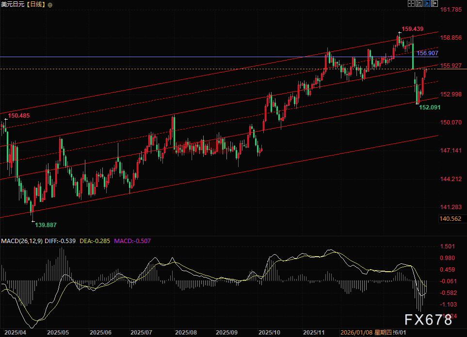 技术面上美元兑日元调整至中轨后围绕高市交易展开快速反弹,日经225也同样创出历史新高。